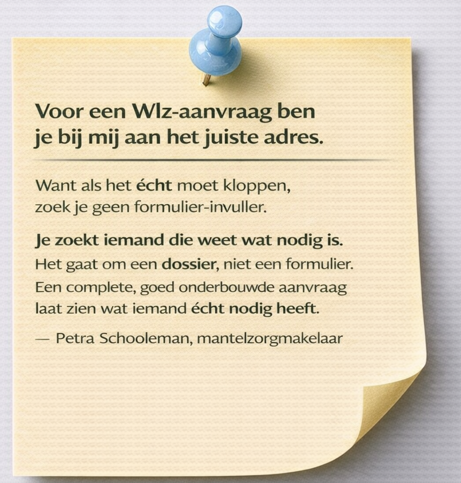 Dat betekent dat ik precies weet hoe een Wlz-aanvraag wordt beoordeeld en waar de onderbouwing inhoudelijk moet staan.